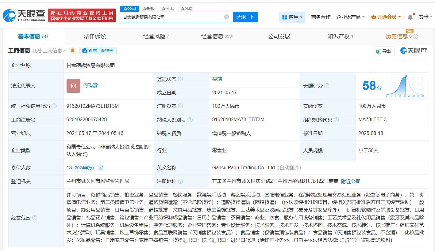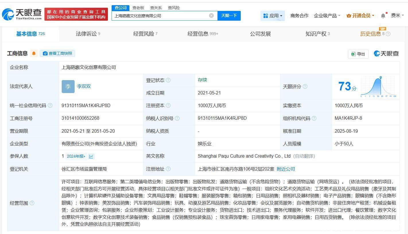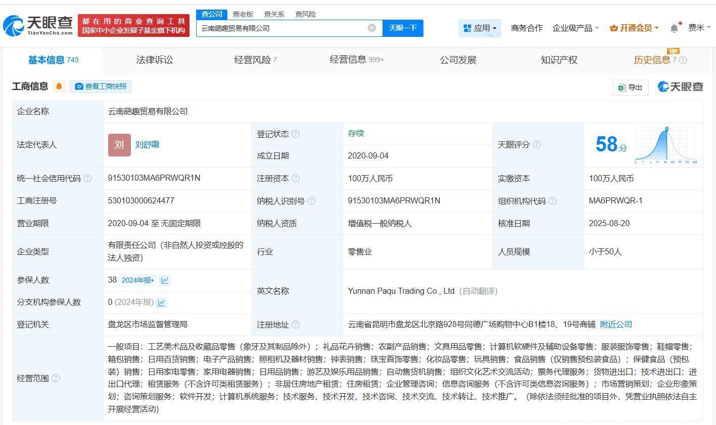 云南葩趣贸易有限公司、上海葩趣文化创意有限公司、甘肃葩趣贸易有限公司分别成立于2020年9月、2021年5月、2021年5月,注册资本分别为100万人民币、1000万人民币、100万人民币,经营范围包括货物进出口、技术进出口、进出口代理等。股东信息显示,上述三家企业均由北京泡泡玛特文化创意有限公司全资持股。