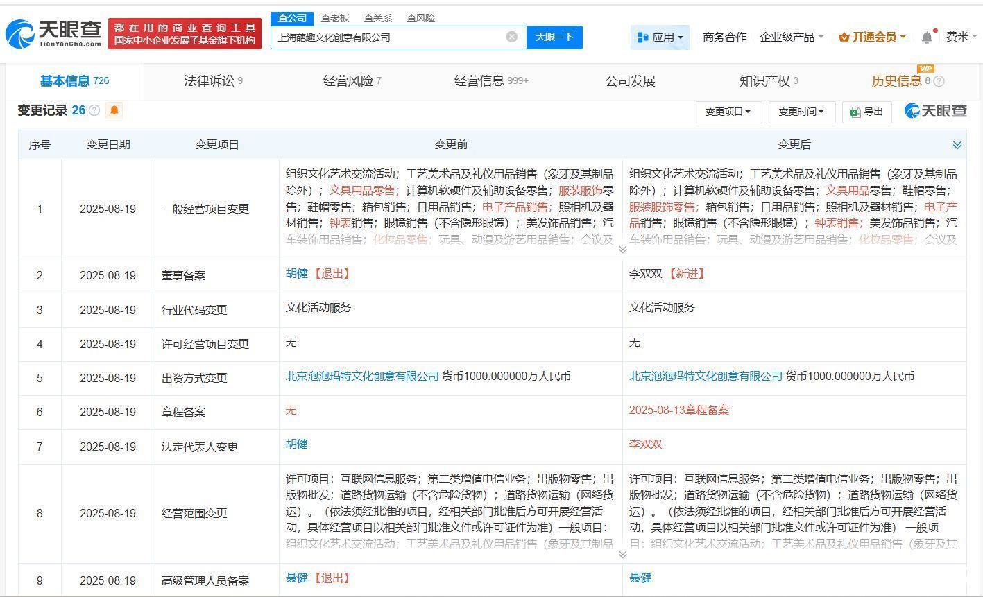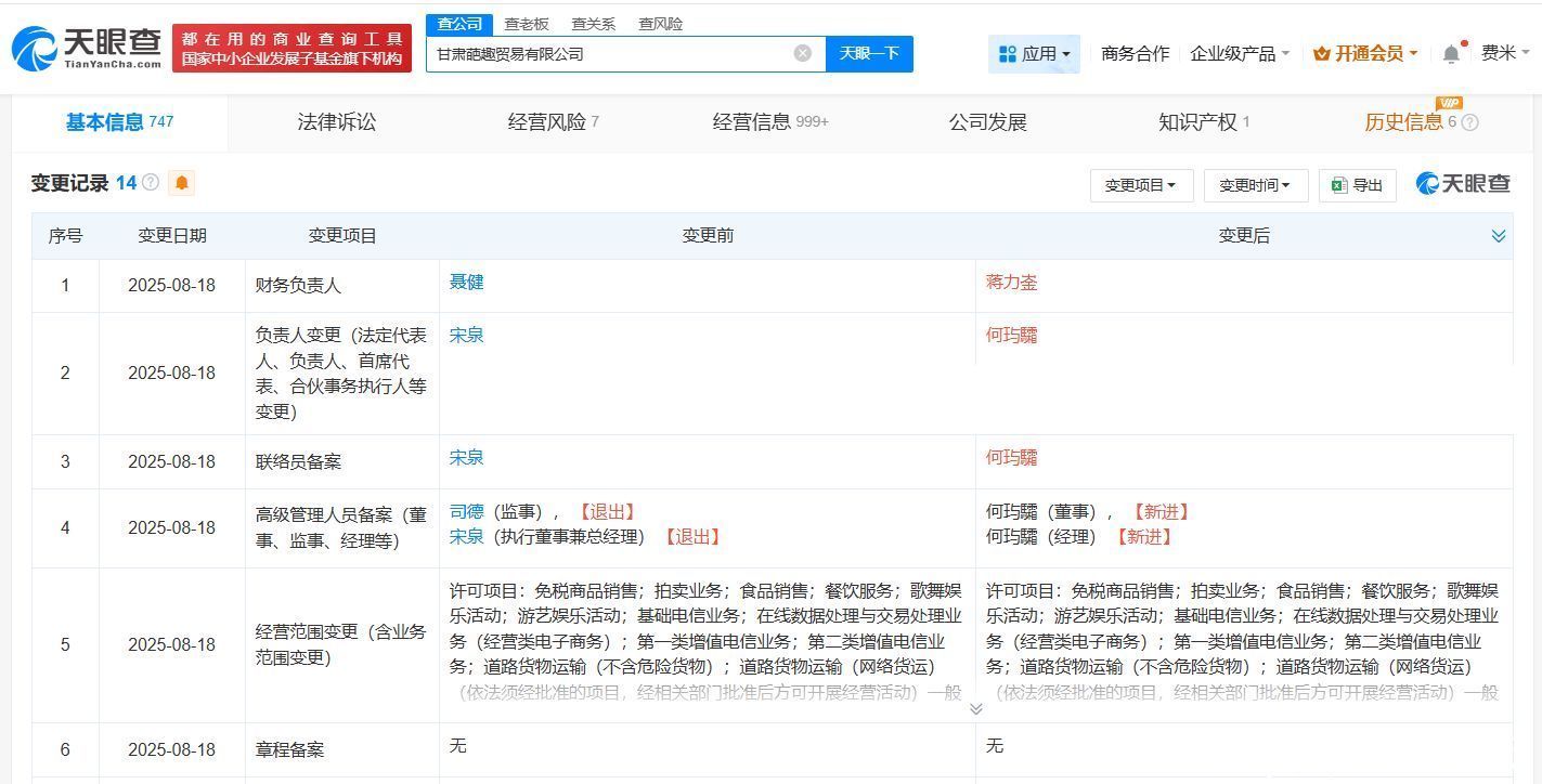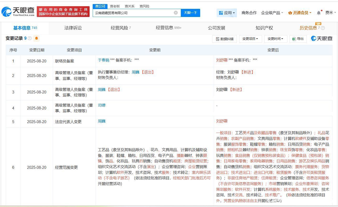 天眼查工商信息显示,近日,云南葩趣贸易有限公司发生工商变更国内配资炒股官网,周巍卸任法定代表人、执行董事、总经理,刘舒霜接任法定代表人并担任董事、经理。此外,上海葩趣文化创意有限公司、甘肃葩趣贸易有限公司均发生高管变更。